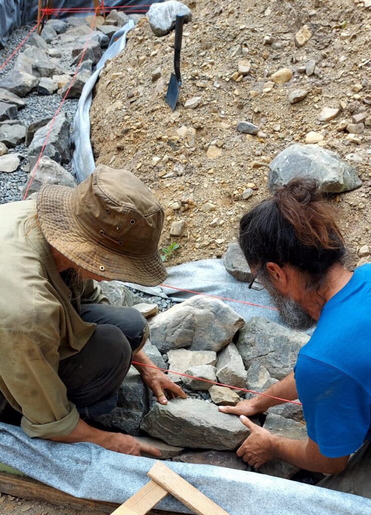 Nous avons choisi des pierres locales sourcées d’un tas de pierres des champs chez un voisin, un matériau gratuit et abondant !