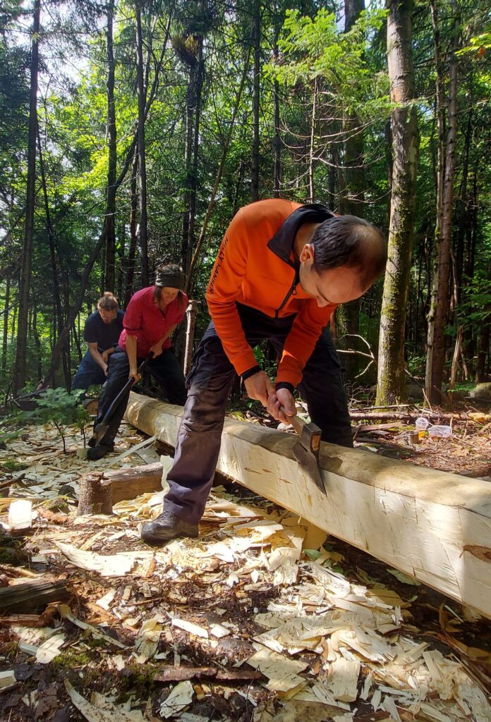 Pour ce projet, chaque poutre a été minutieusement équarrit à la hache en suivant des dimensions précises. Le bois a été récolté chez des personnes de notre entourage qui ont à cœur notre projet. Chaque abattage d’arbres a été exécutée dans un contexte d’éco-foresterie appliqué.