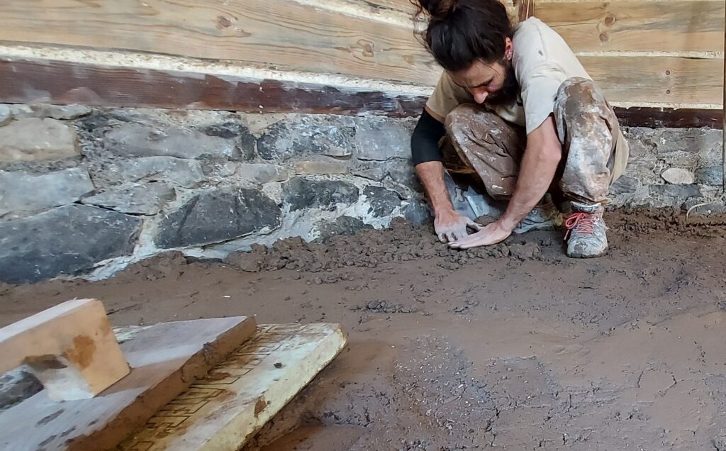 Nous avons fait une dalle chauffante en terre crue. La terre et l’argile sont naturellement abondantes sur notre hameau. Conçu sur le même principe qu’une dalle en béton, mais les matériaux utilisés sont très locaux, abondant et gratuit.