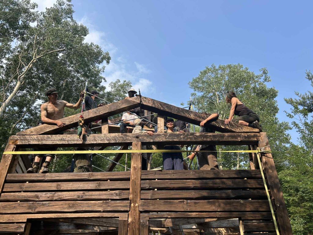 Pour ce projet, chaque poutre a été minutieusement équarrit à la hache en suivant des dimensions précises. Le bois a été récolté chez des personnes de notre entourage qui ont à cœur notre projet. Chaque abattage d’arbres a été exécutée dans un contexte d’éco-foresterie appliqué.