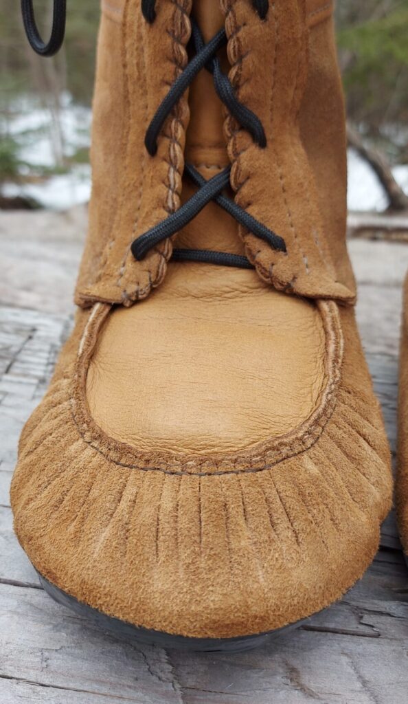 Les mocassins peuvent être confectionnés entièrement en cuir, dans ce cas, le haut est fait en cuir de chevreuil souple ou orignal aminci 3oz et des lacets sont ajoutés.
